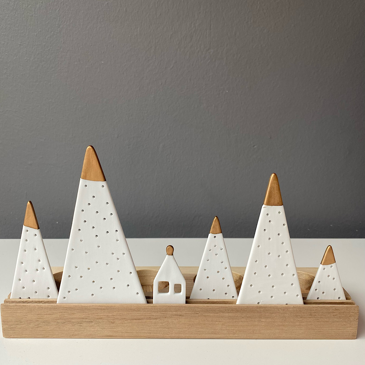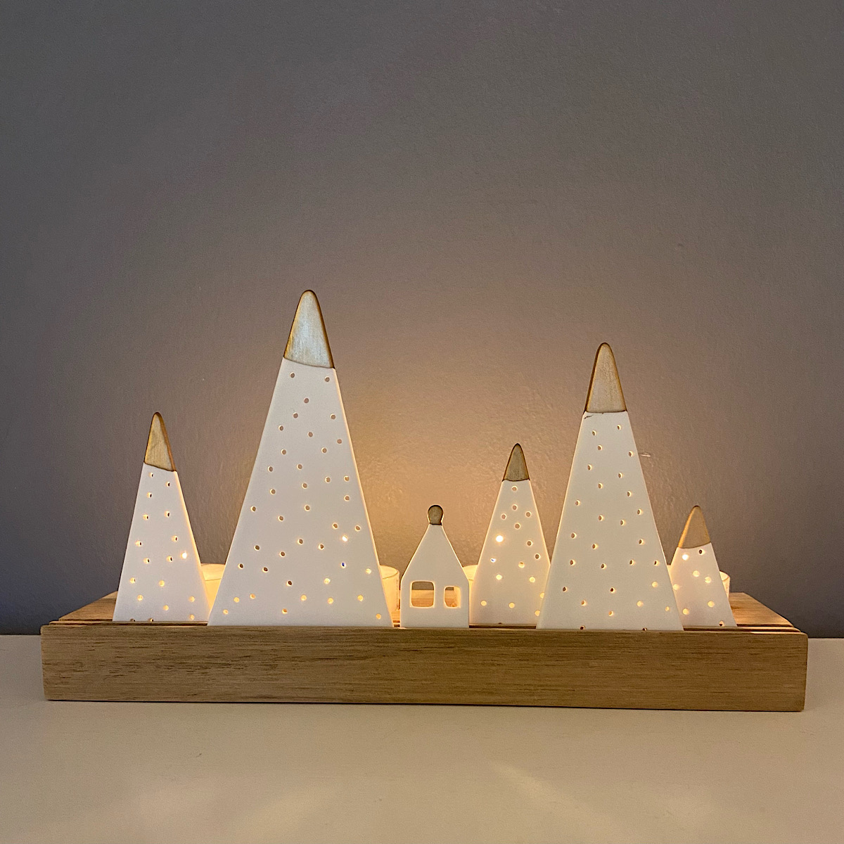 Wooden base with porcelain inserts, some with a gold glaze. Holds four standard tea lights (not included).