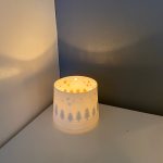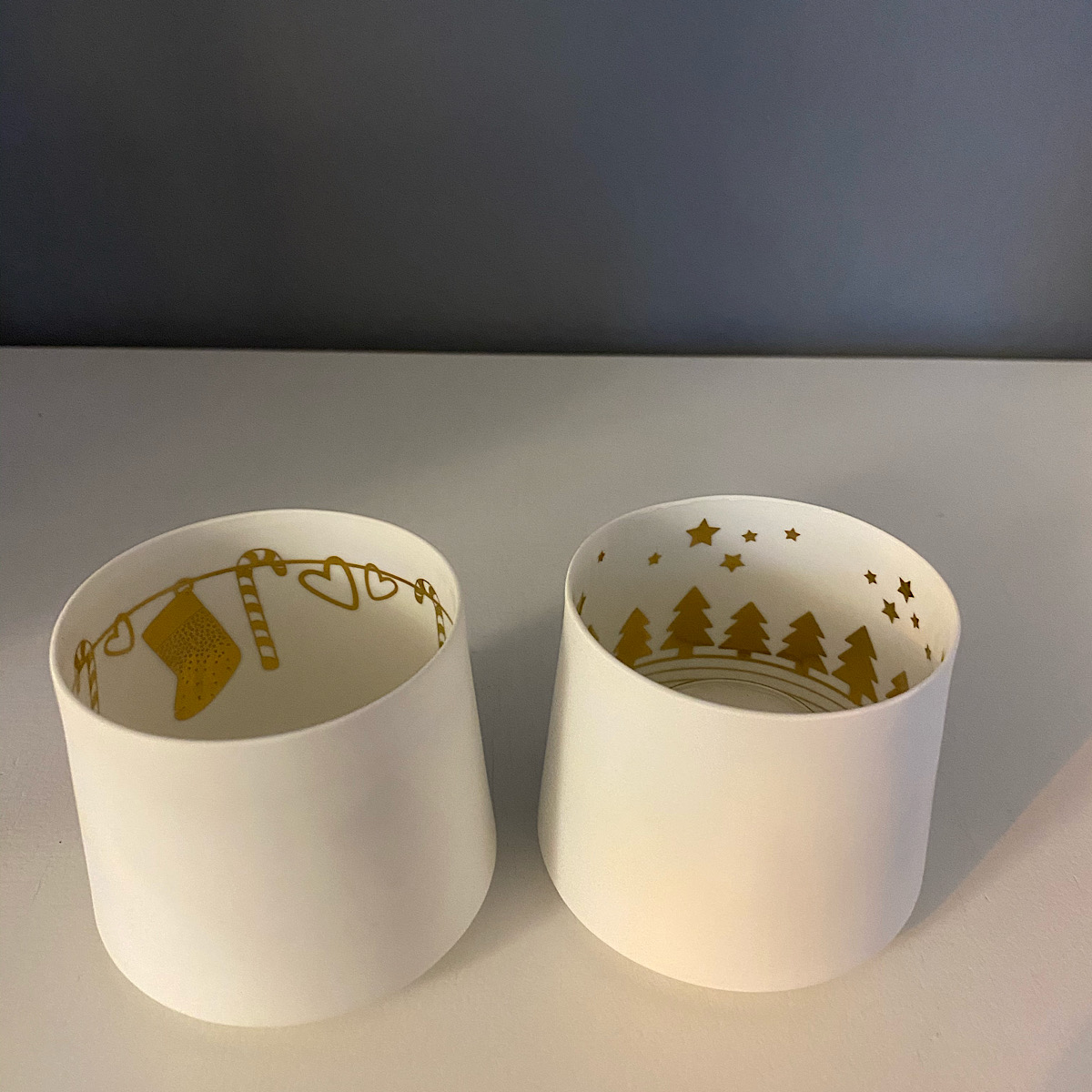 Delightful porcelain tea light holders, matt white on the outside, glazed on the inside with gold decal image which shows though when the candle is lit.